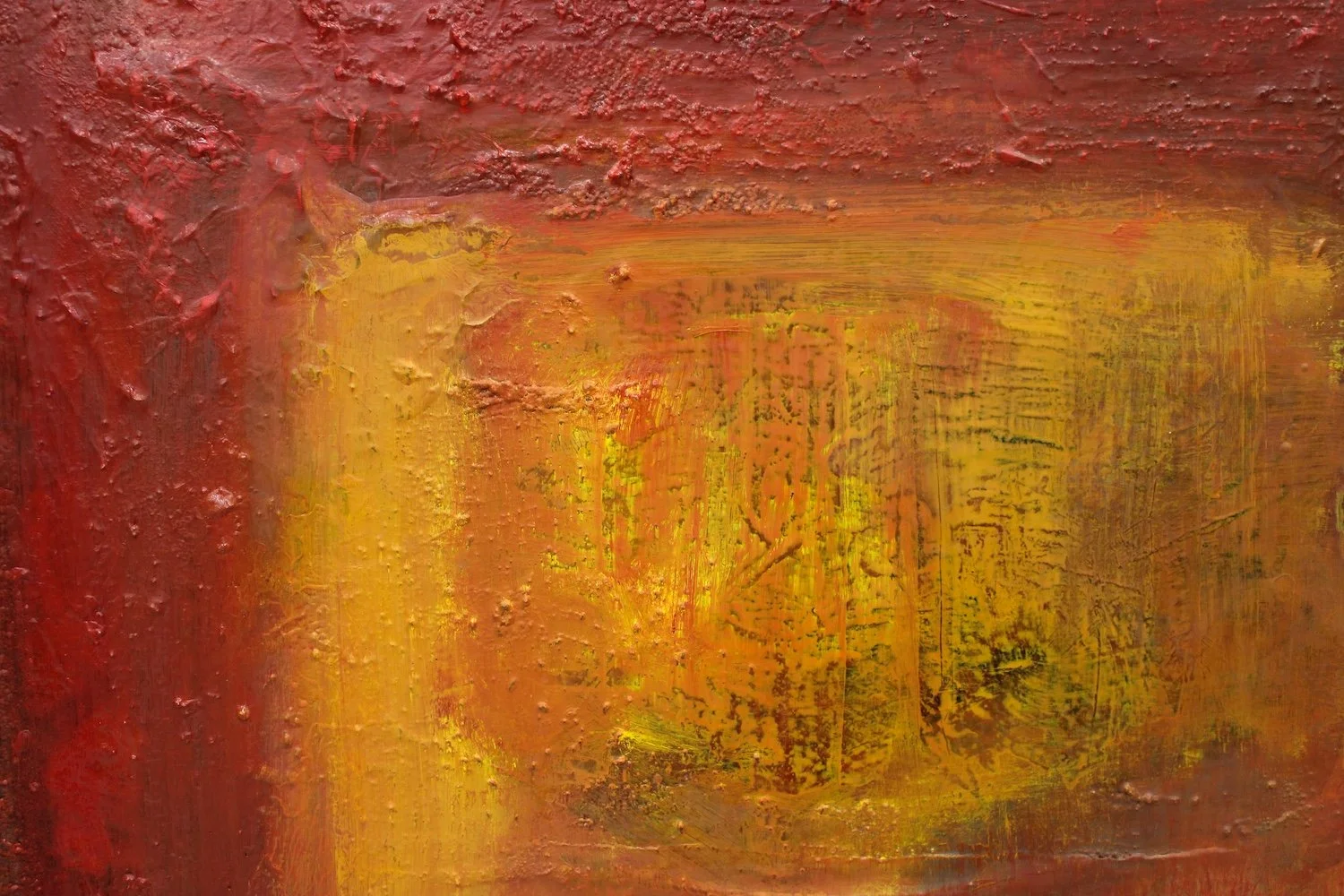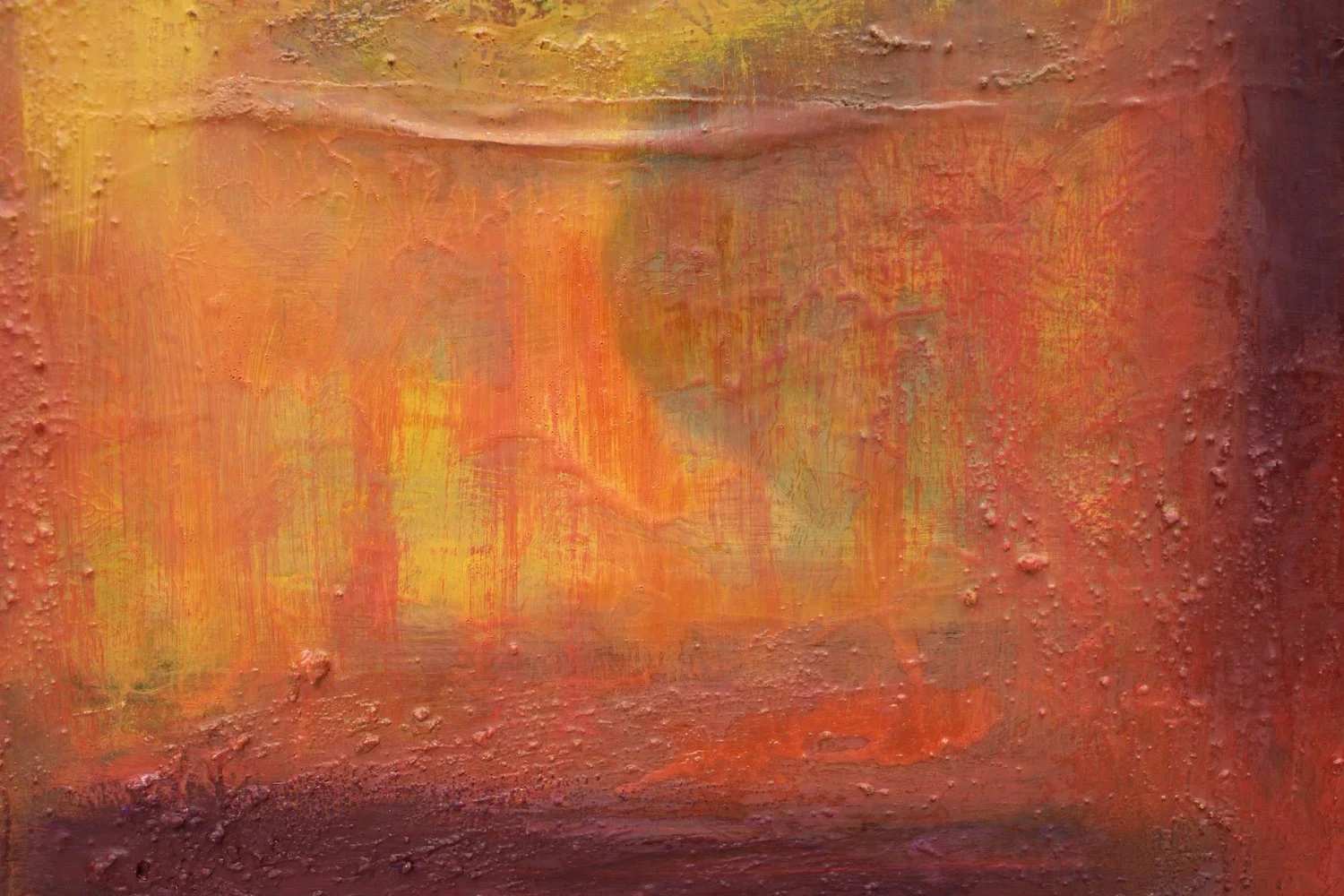 This painting embodies the elemental force of heat, not through depiction of fire but through its very material presence. Layers of oil and acrylic have been scraped, scarred, and built into ridges that resemble fissures in a scorched environment. At the center, a luminous field of yellows and oranges glows with the intensity of molten heat, as if the canvas itself were ignited from within.