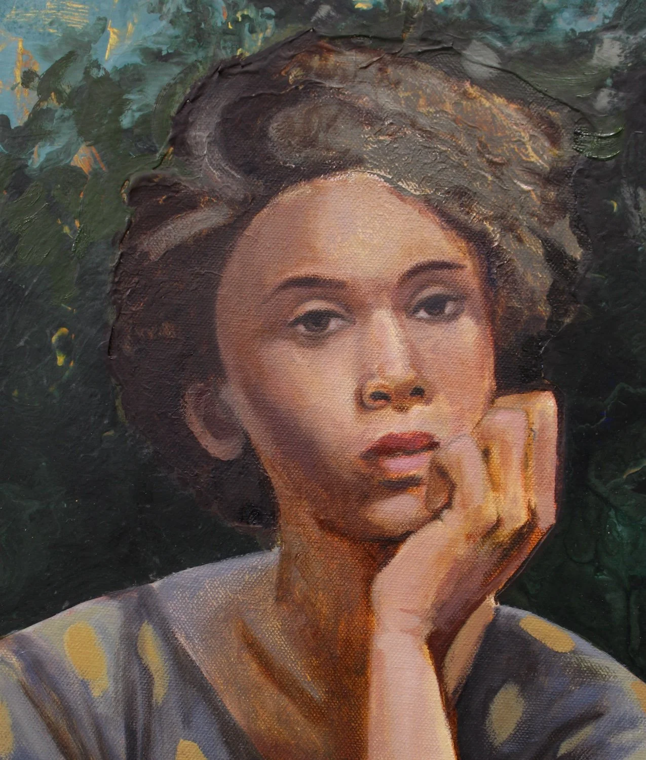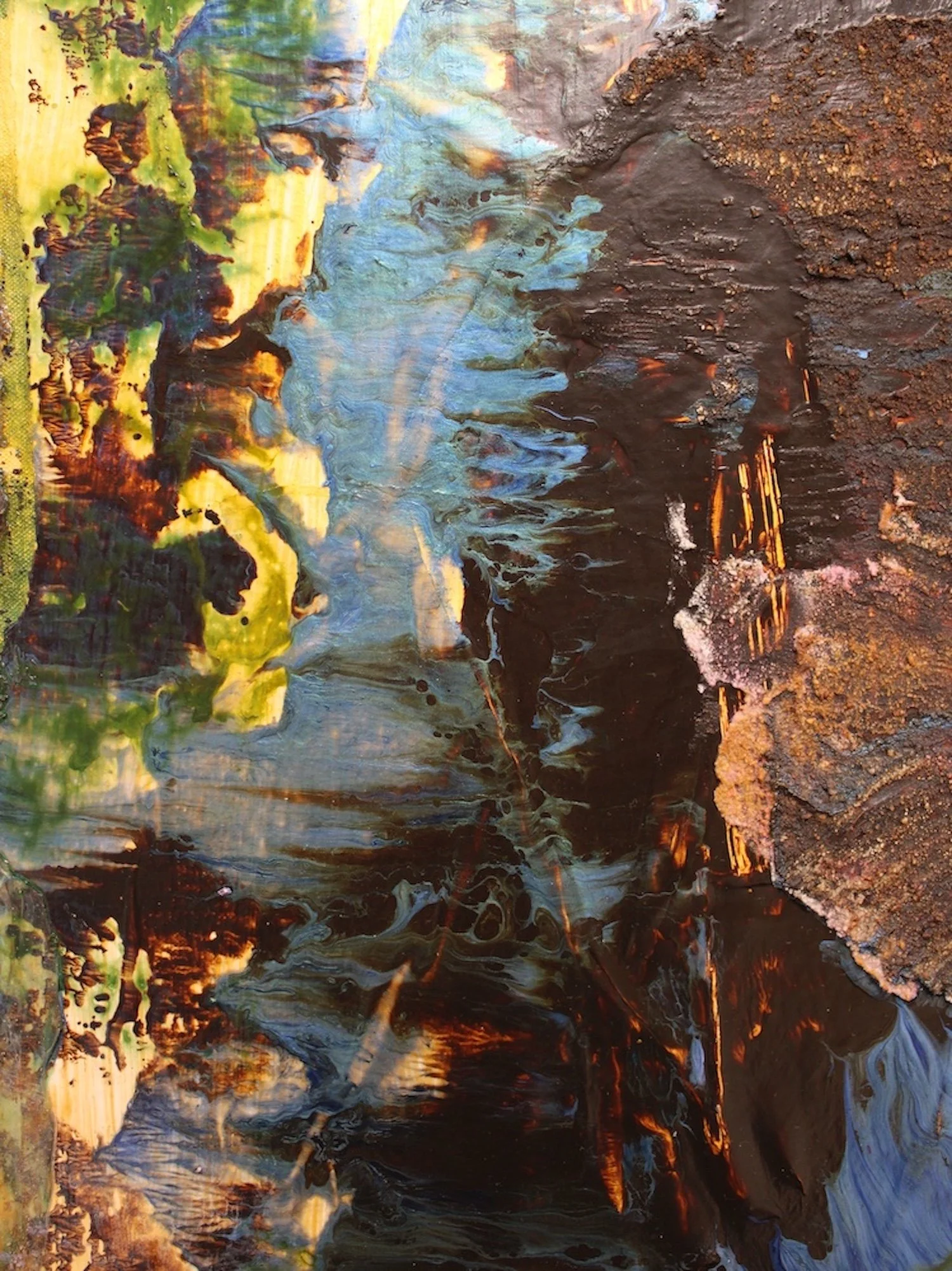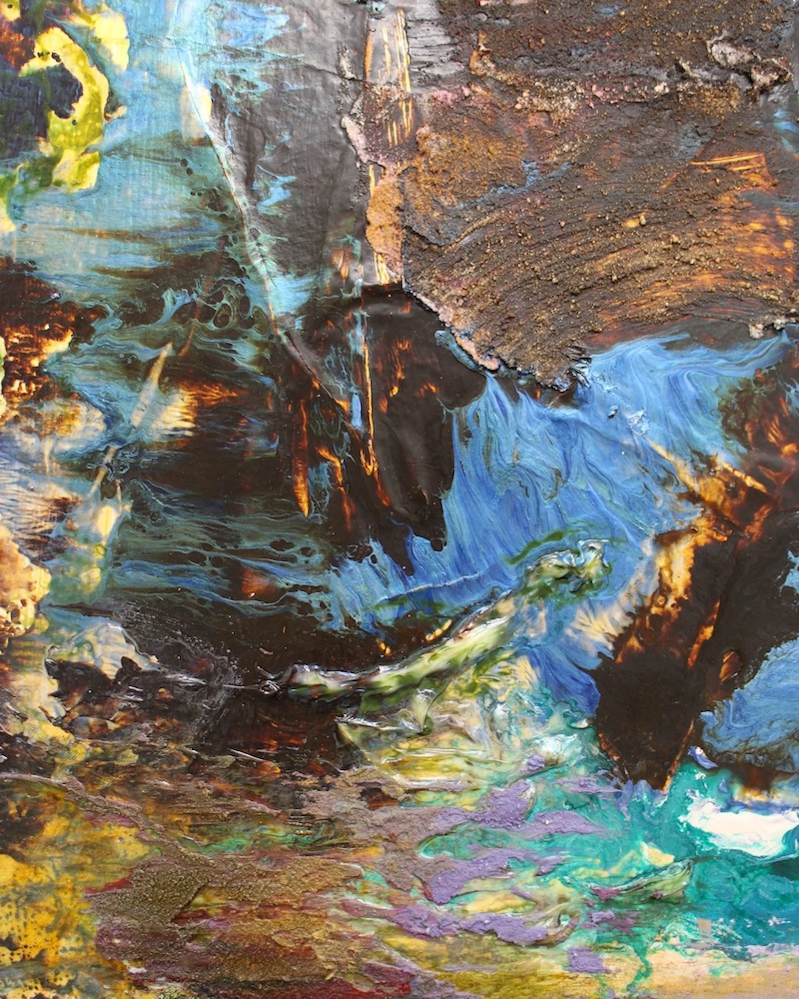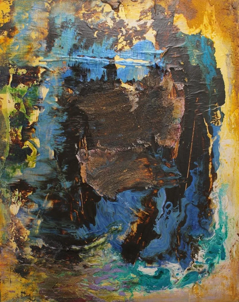 This work occupies a quieter register within my abstract paintings that treat the canvas as a living body. A dense central mass of grey-green texture, scraped and pressed into the surface, suggests compressed sediment. Around it, veils of pearl blue and radiating fields of yellow shimmer like atmosphere, positioning the painting between earthbound solidity and airy expanse.